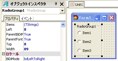 In Borland Developer Studio (Delphi 2005), the TRadioGroup component is used to easily create and manage a set of radio buttons on design-time. You can add radio buttons to the TRadioGroup by just opening the object inspector pane and editing the Items property of the TRadioGroup. The strings you add to the Items property represent the captions of the radio buttons that appear automatically within the TRadioGroup. As shown in the following image, the strings "Item1", "Item2", and "Item3" that were added to the Items property via the object inspector (left pane) appear as captions of the radio buttons on the Form.